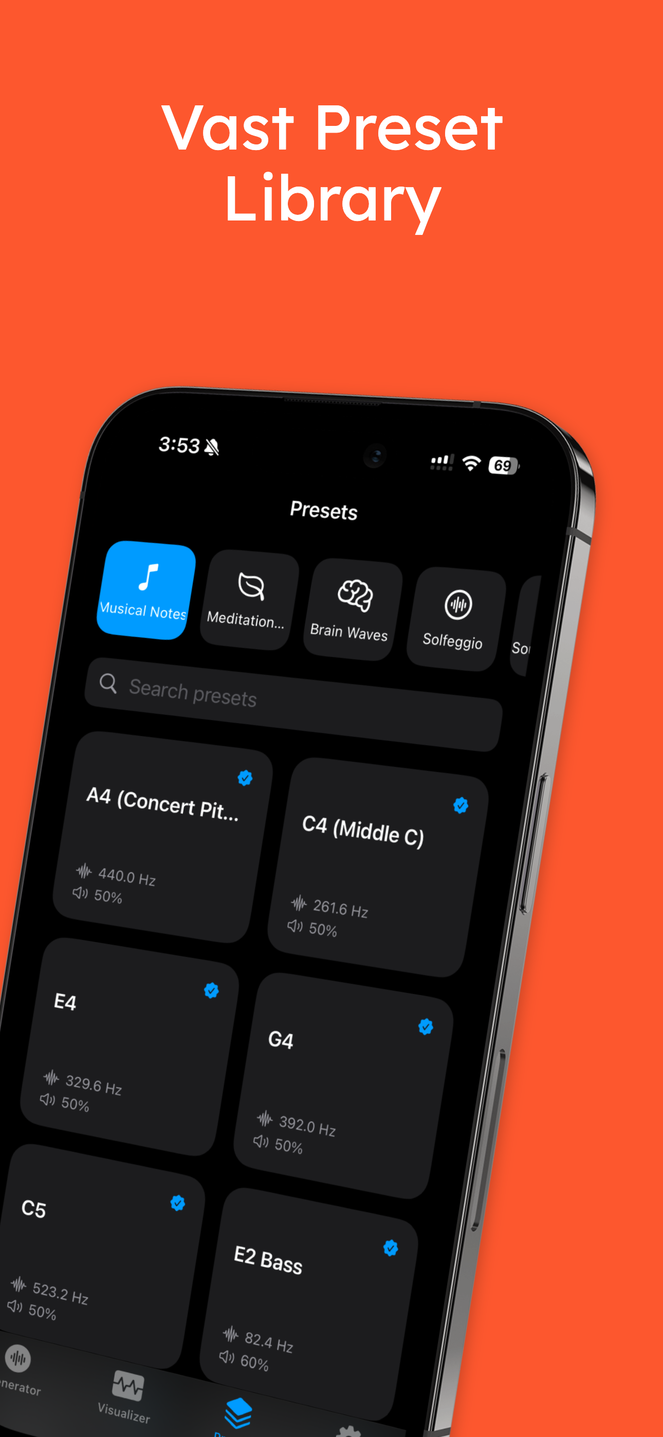 Access over 30 carefully crafted presets for music, meditation, and testing